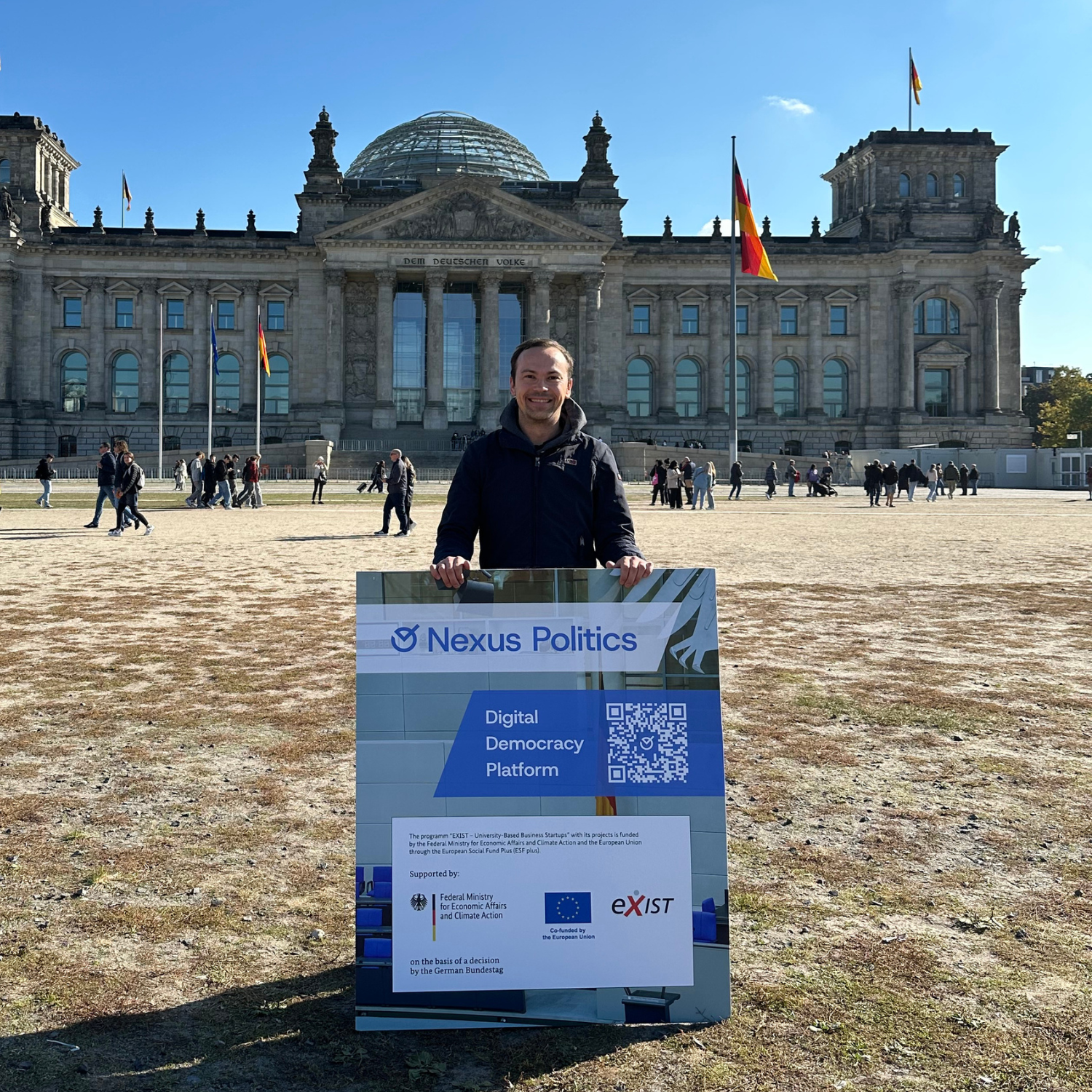 That's what Nexus Politics is - a behavioral design project applied to democracy. Make participation easier, and more people participate. Make responsiveness visible, and politicians become more responsive. His co-founder Christoph Waffler brings the technical side - computer science, also from TUM. Together they received an EXIST startup grant, are based in the TUM Incubator, and are supported by TUM's Professorship of Policy Analysis.